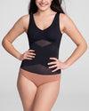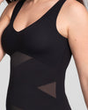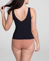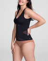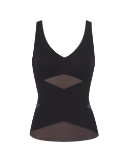 This shapewear tank top features a built-in, molded, wireless bra that lifts without sacrificing comfort. Targeted X compression uses doubleknit panels to shape your back and tummy, while releasing everywhere else for maximum comfort. Silicone gripper at the bottom hem keeps the the top anchored as you move. The tank's versatile design can be worn on its own or under clothing.
