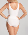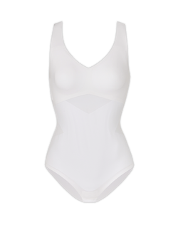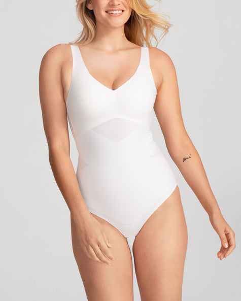 Targeted compression and a built-in wireless bra take this shaping tank bodysuit to the next level. Doubleknit panels sculpt at the midsection, and bonded back panels give a smooth silhouette under clothing. Wide straps provide extra support and lay gently on the skin. An adjustable gusset lets you customize your fit and makes it easy to use the restroom. Silicone gripper on the brief prevents wedgies without digging in.