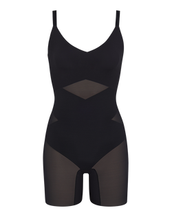This shapewear bodysuit features targeted X compression with doubleknit panels to sculpt without squeezing, a supportive built-in bra that lifts without underwire, and bonded fabric back panels that create a smooth finish under fitted clothing. With a 6 1/2" inseam, these shorts offer full thigh shaping. A gusset opening makes for easy bathroom trips.