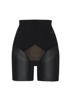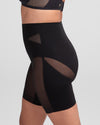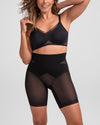 Sculpting starts at the natural waist in this mid-rise short. This shaping short features strategically placed doubleknit compression, an 8 ⅛" inseam for thigh shaping, and a gusset opening for bathroom convenience. Pairs perfectly with low-back clothing styles and high-waist bottoms.